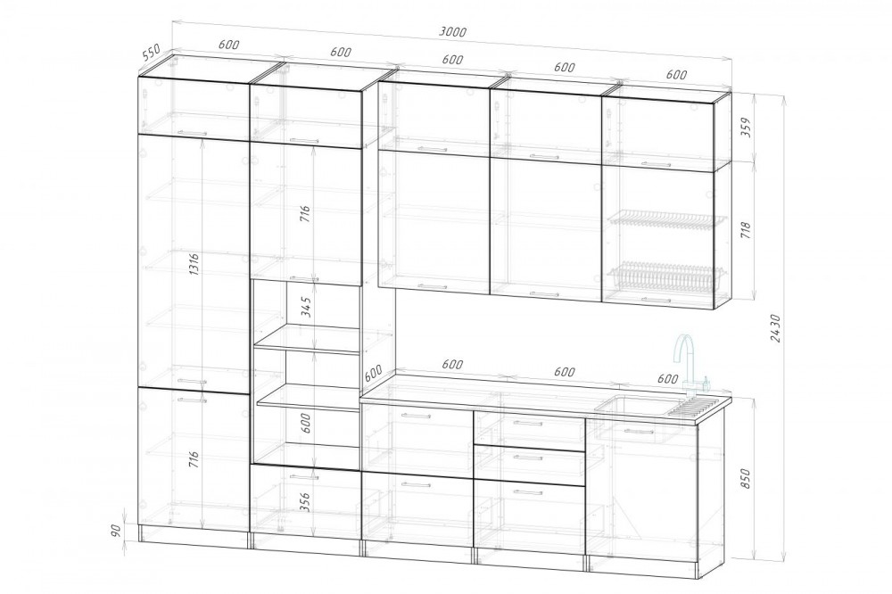Ширина: 3000 мм; Глубина: 600 мм (со столешницей)