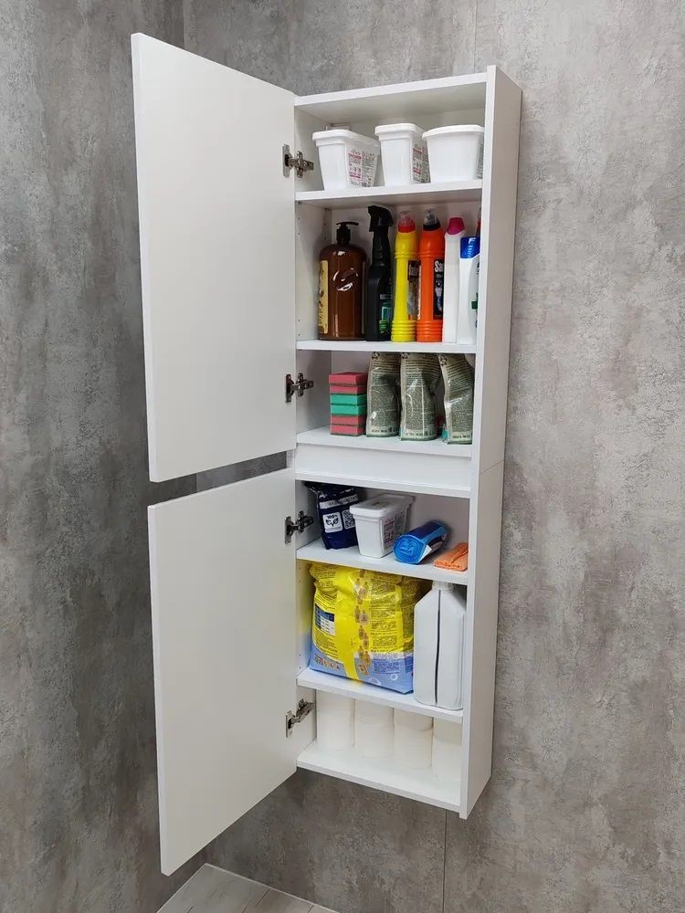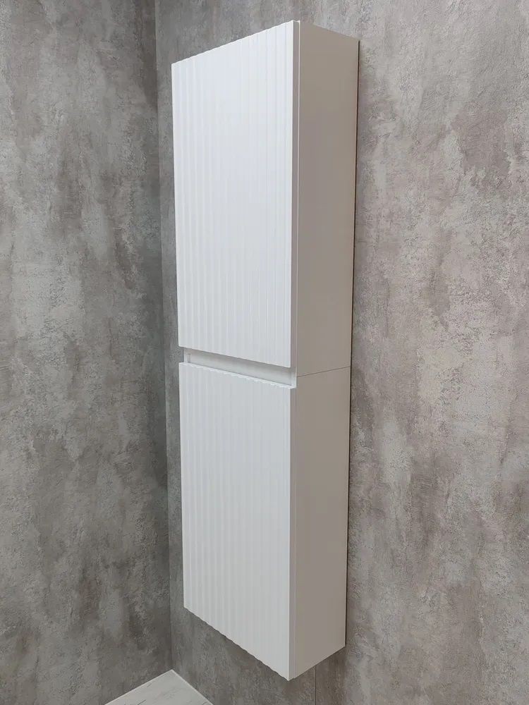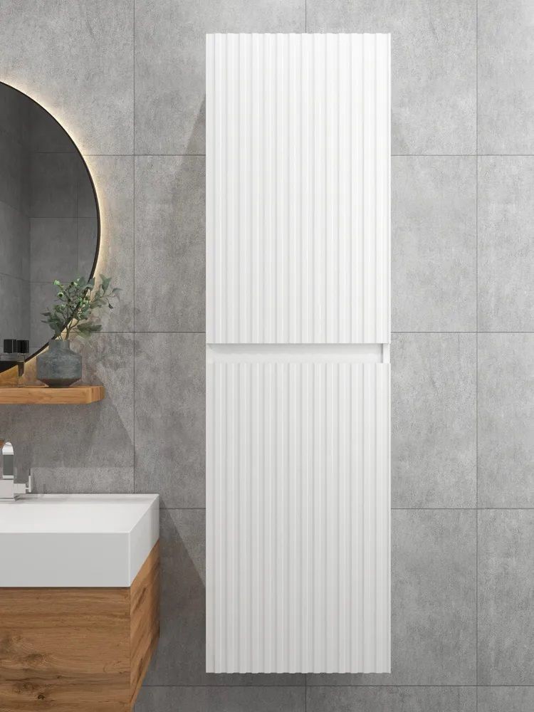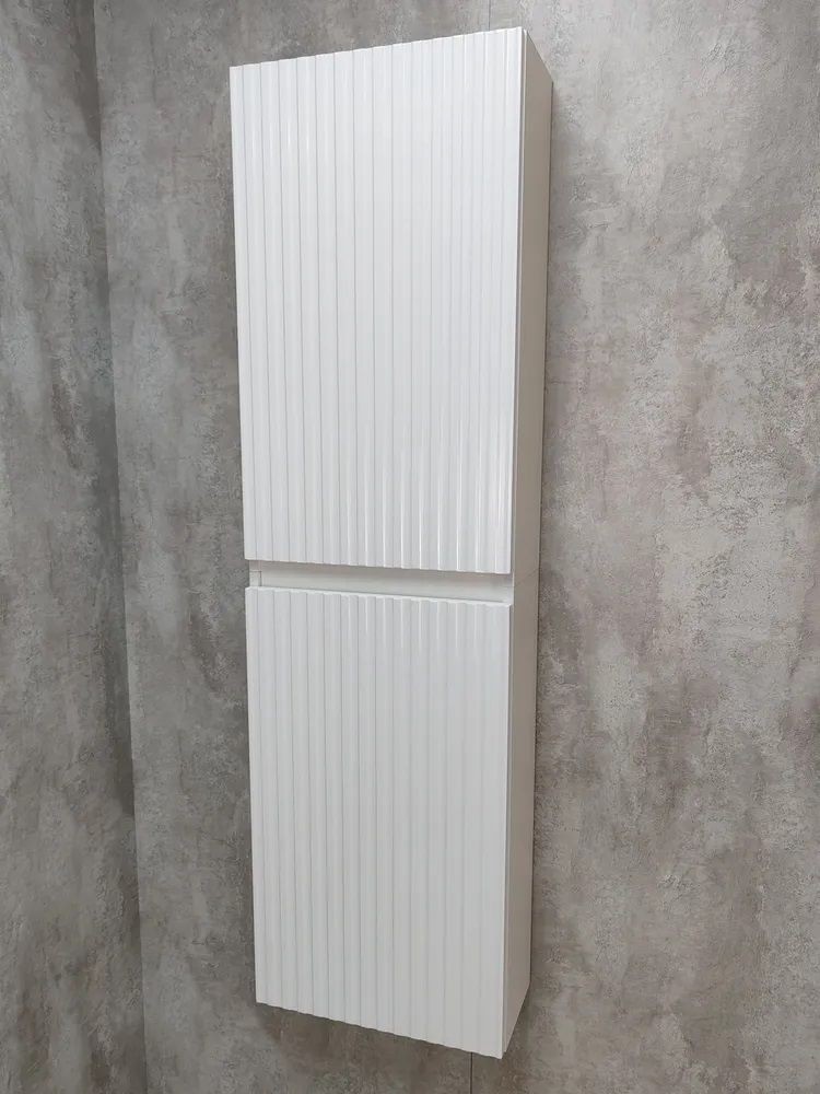 Белый шкаф пенал с рифлёным фасадом будет отлично и стильно смотреться как в ванной, так и в туалете. Шкаф пенал с полками можно повесить в прихожей, в коридоре и использовать для хранения небольших вещей и мелочей. Такой белый навесной шкаф можно использовать как шкаф навесной в гостиной или как шкаф для детской.