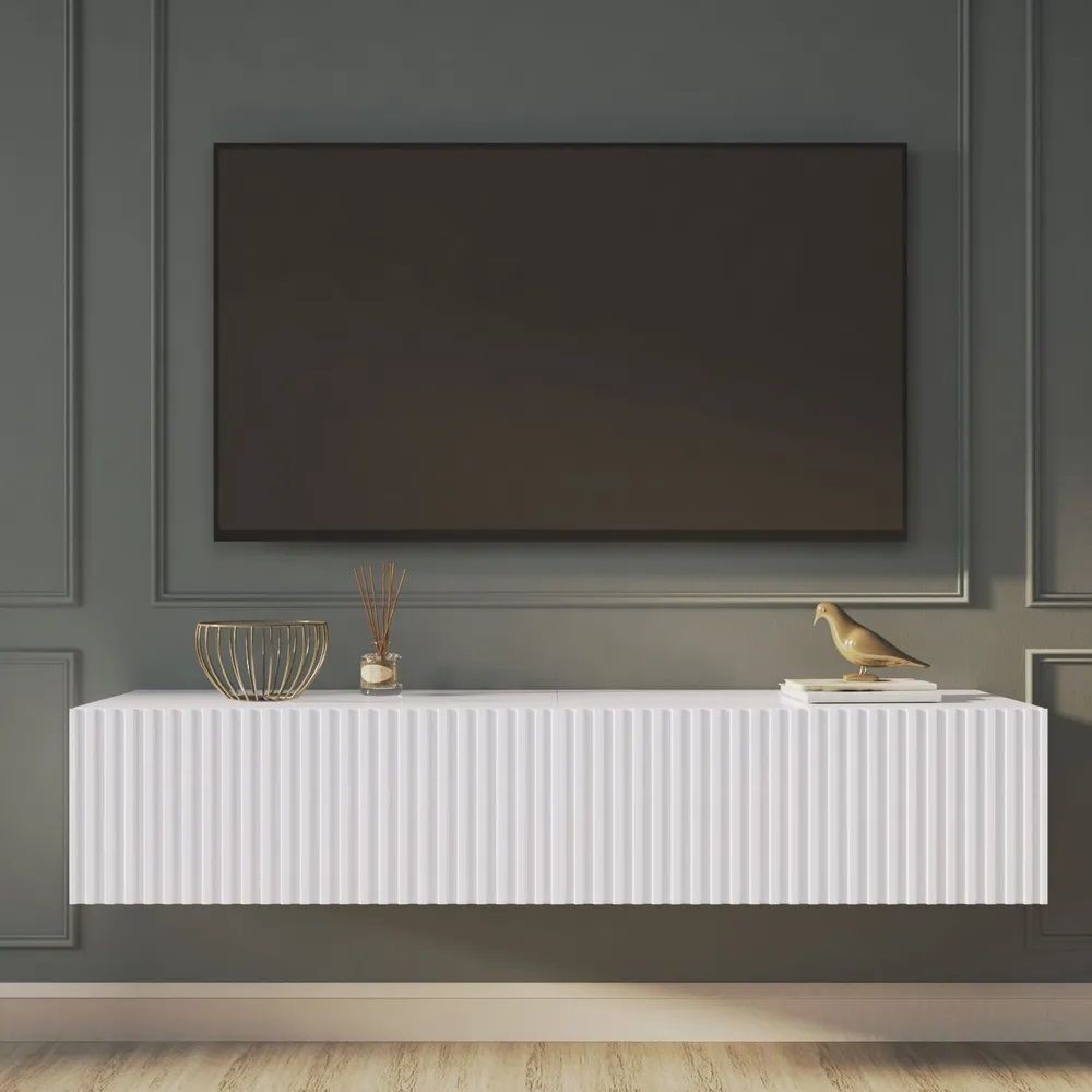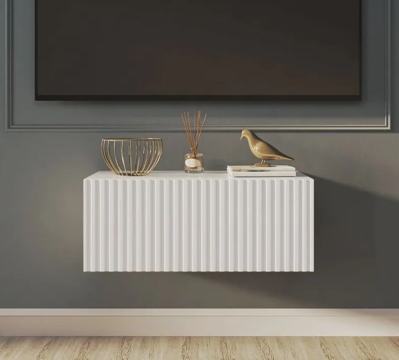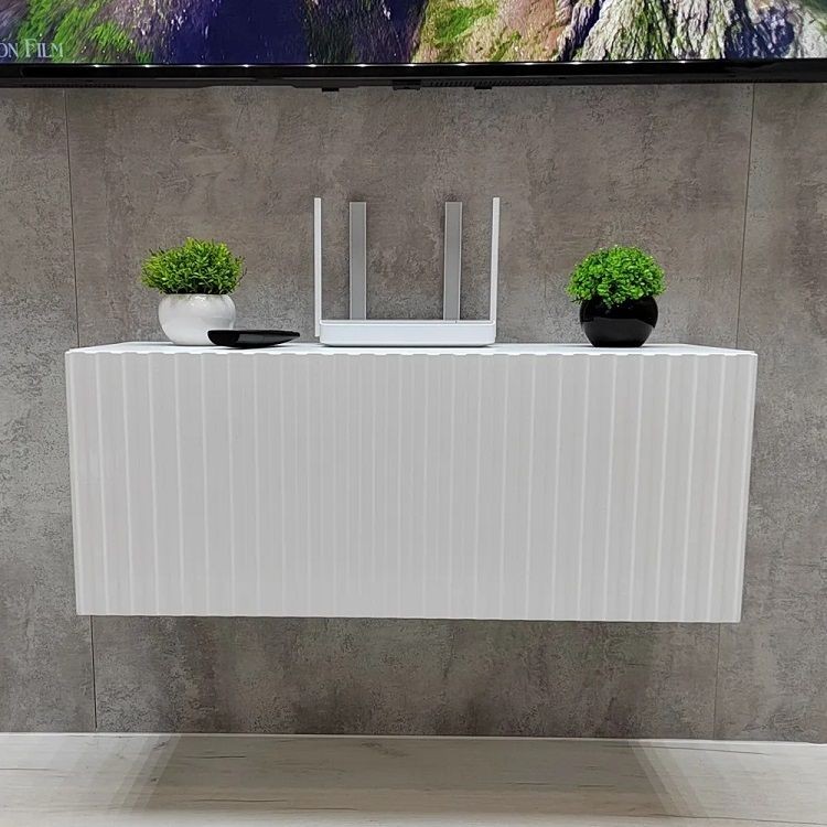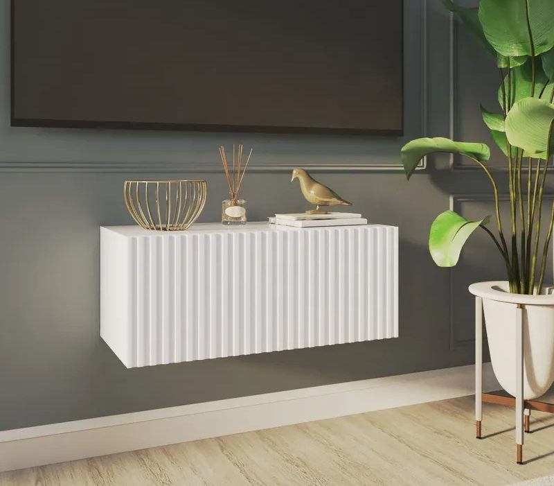 Благодаря своей компактности тумба под ТВ подвесная поможет сэкономить пространство, избежать ощущения загромождённости гостиной, спальни или детской комнаты, а рифлёный фасад будет акцентировать